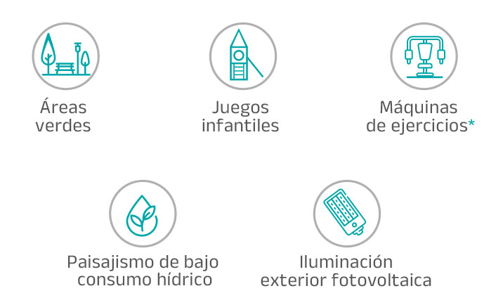 Vive en un proyecto sostenible y armónico con su entorno, a través de un elaborado desarrollo de paisajismo, con especies navitas de bajo consumo hídrico y riego tecnificado, que se combinan con zonas equipadas con juegos infantiles, máquinas de ejercicios y más.